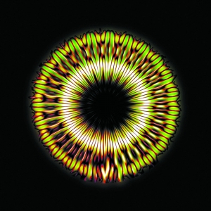 座头鲸交配时的声音。 声学工程师费舍尔利用声学技术,将座头鲸交配时的声音中的低频率呻吟声和哭声按逆时针方向,以可视化的图形展现出来。本图所表达的声音录音于夏威夷。