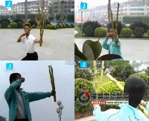 接着该新闻以《射雕英雄传之华山论剑》的片头曲为背景,播放了电视台记者在街头请教“射雕大侠”的场景,一位晏先生正拿着既像弹弓又像烧烤叉的甘蔗在比划,以证明其是多功能,可以“射雕”、可以当烧烤叉,记者还煞有介事地采访了市民和卖甘蔗的小贩,均表示没有见过。