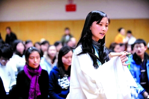 这些学生究竟是因为什么选择昆曲呢?是追逐时尚,还是因为别的原因?一位选修了这门课程的同学告诉记者:“我接触昆曲是从中学开始的,最早是和家里人一起去剧场看,就觉得特别美,虽然刚开始听不大懂,但是辅助剧场的字幕也能看明白。真正喜欢它的原因还是它能够营造一种非常高雅特别的意境,正是这个吸引了我,上大学以后,能遇上这么一门课程我觉得特别幸运,它的那种平静宁远让人沉醉。”