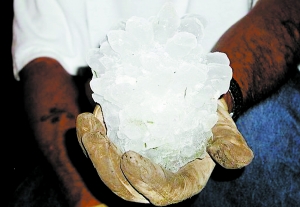 这个冰雹直径约18厘米,周长近48厘米,降落于内布拉斯加州。这是美国发现的最大冰雹。冰雹是夏天激烈的雷暴天气所产生的,一些水滴和冰晶并合冻结成较大的冰粒,当上升气流无法支撑时落下。它们会对作物和财产造成严重损害。