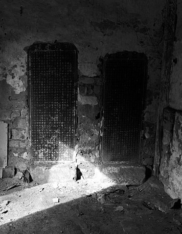 穿过平地,是龙虎殿,几根树干撑着屋檐,以防坍塌。站在门口,可以看到前方的大殿。但是,大殿只剩下几面墙壁和几根被烧焦的柱子。