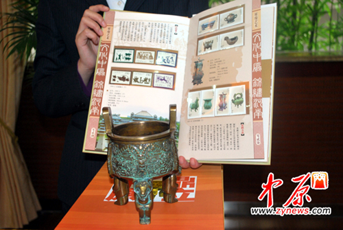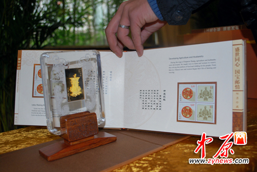 本次活动还现场展示了由中国邮政集团公司批准发行的《河之南》邮票珍藏册,《国宝邮情》双连壶。内容涵盖建国珍邮、中原“国宝”、贵金属等多个方面。该系列邮票浓缩了中原文化的博大精深,彰显中原文化在中国文明史上的核心地位。这也是郑州市邮政局连续五年为拜祖大典奉献的文化盛宴。