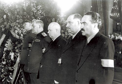 高官为斯大林守灵,中间是我们中国人所熟悉的赫鲁晓夫。