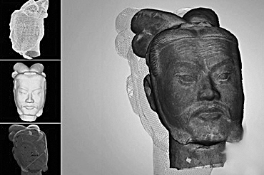 通过三维扫描的方式,研究人员把碎片的外形曲线、以及断裂面凹凸起伏的特征输入计算机。然后计算机会以一块较大的碎片为基础,对采集到的其他碎片样品逐一分析,直到找到吻合最完美的另一块碎片。这样不断比较下去,当一个陶俑各个部位的所有碎片都被找齐后,一个完整的陶俑排列图也就产生了。