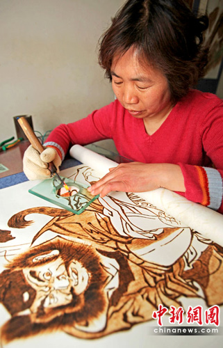 中新网南阳5月6日电 (记者 徐华美 通讯员 王子瑞)日前,记者在河南省南阳市看到烙画女工在丝绢上烙画《钟馗打鬼图》。