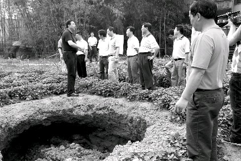 “又垮了一个坑。”对于出现的“天坑”,当地村民们在紧张害怕的同时,似乎有些习以为常了。新出现的天坑位于红旗村6组,直径不到2米,村民们说,这个坑是4日下午6点过垮的。除了这个坑,村民们称,之前已经存在的“天坑”有些还在继续垮塌,但已经没有前几天厉害。