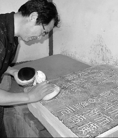 6 日中午,记者闻讯赶到闵子骞墓。在园内,看到几名考古人员正为两块方形石碑做拓片。经认定,这就是目前仍在进行考古发掘的明崇祯“太守墓”的墓志铭,一块是“盖”,另一块是“身”,碑身均保持完整。其中“盖”上面共有37字,内容为“明故中顺大夫广东高州府知府华庭赵公暨原配赠宜人张氏继配封宜人范氏合墓墓志铭”。“身”碑上刻满了密密麻麻的小楷字。遗憾的是,因为风化严重加之每字只有不过一厘米见方,一时难以解读。据推测其内容应为具体记载墓主人一生身份地位变化,以及子嗣情况。