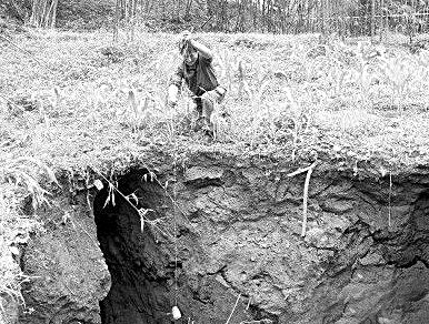 随着“轰”的一声巨响,硐底镇石垭村“大弯头”出现了一个巨大的坑。巨响后是持续十多秒的“哗哗”声,那是地层塌陷后,沙石滑到坑底的声音,每一声都让人发抖、发冷。