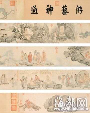 根据保利提供的资料,《十八应真图卷》上有乾隆恭楷亲题引首:“游艺神通”四字,并赋七言古风长诗一首于画卷之上,垂爱之情溢于言表。吴彬作品得乾隆亲题者仅此一件,正是“宝笈之宝”。卷末吴彬的题款“乙卯春日写于绣佛居”,创作时间正是1615年。
