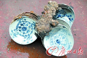 “南澳Ⅰ号”明代古沉船部分隔舱板已在水底现身,各组隔舱板之间满是一摞摞码放整齐的文物。记者昨日从广东省文物局获悉,由广东省文物考古研究所与国家水下文化遗产保护中心共同实施的“南澳Ⅰ号”水下考古项目已经取得阶段性进展,水下考古队在抽取沉船上层覆盖淤积物的过程中,已经清理出相互平行的3组木质沉船隔舱板,隔舱板之间间隔约为1米,这些间隔就是古船装载货物的空间。昨日,在发掘进入船舱内后,文物出水速度极快,昨日下午专家对已发现的“一号舱”进行打捞,结果让八吊篮文物从海底重见天日。
