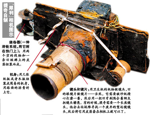 他搜集身边的每一样垃圾,螺纹线轴、卫生纸卷、玻璃眼镜片、纸板、口香糖、脱落的头发……然后,他将它们组合到一起,变成一部可以使用的相机。