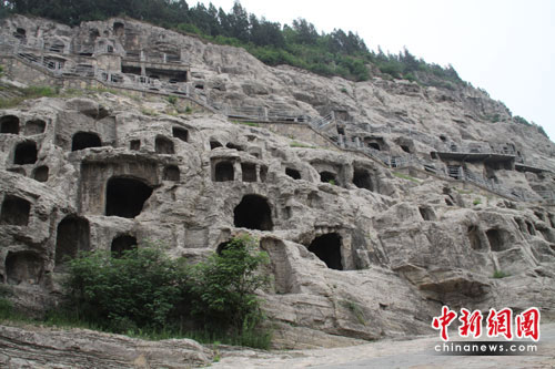 中新网5月26日电(马学玲)第九届“网上看河南”南线采风团26日上午探访龙门石窟。记者在现场看到,石窟内较多雕像遭破坏,有的雕刻失去头部,有的失去比如手臂等身体其他部分。据悉,在迄今为至的一千四百多年里,龙门石窟曾遭受到自然风化的侵蚀和人为的破坏。
