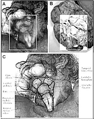 苏克和塔玛尔戈花费了4年时间对此进行研究。他们将人类大脑解剖图像和画中上帝颈部的画面重叠对比,出乎意料地发现两者的轮廓竟然惊人地相似!上帝喉咙处凸出的部分就像延脑椎体,而喉咙上部的肌肉则像脑桥。(见图1)画中上帝所穿长袍上的腰带呈现出来的奇特线条,则代表了人类的脊骨。两位医生认为,米开朗基罗有意通过略显拙劣的笔触,引导人们发现他在壁画中隐含的解剖学知识。这一研究成果在今年5月最新一期的《神经外科学》杂志上发表后迅速引起人们的关注,米开朗基罗和他的《创世纪》也再度笼罩上神秘的色彩。