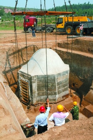 为了确保该墓成功整体搬迁,考古人员用石膏等材料在墓穴外围做了一层防护,在墓穴东北角处搭置有一个平台,平台上放置了4根铁轨作为底座,墓穴整体吊出地面后被放置其上。深坑中的墓室下方被整体架起,墓室成为一个可以移动的整体,然后由吊车进行搬迁。