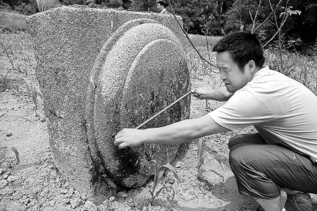随后,记者与李晓宏又在村民的玉米地里发现了很多瓦片。玉米地旁不远处,四块上圆下方的石头引起了李晓宏的注意。“这是柱础石。”李晓宏肯定地说。经过现场测量,柱础石呈三层,最大的一块直径为1.2米。据李晓宏讲,柱础石主要用作建筑物立柱的底座,像这么大的柱础石十分少见,而且能说明当时寺庙的规模是非常宏大的。经过查看研究,李晓宏告诉记者,根据现场的情况初步判断,这可能是一座唐代的皇家寺庙,而且规模较大。当日,一共测量发现了25块大型的柱础石以及部分彩色的瓦片和刻有鳞片花纹的瓦片。