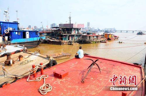 中新网南昌6月30日电(记者段长征)6月30日,滞留船只停靠在南昌赣江大桥处。受前段时期强降雨的影响,使江西赣江水位急速上升,导致南昌八一大桥等跨赣江的大桥与水面距离缩短,使部分大型船只无法过桥。目前,赣江南昌段水位虽有所缓慢回落,但由于水势仍处高位,过往船只受影响无法通过桥洞,仍有近百艘船只滞留江中。