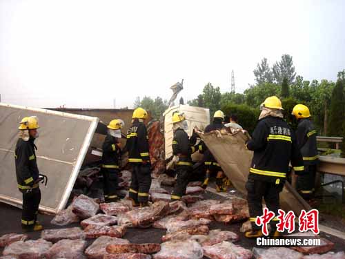 中新网连云港7月7日电(苏欣 朱晓颖)7日清晨5时15分左右,在江苏省宁连高速由南向北283公里处,一辆满载冷冻肉食品的货车发生侧翻,满地尽是冷冻肉。消防官兵和交巡警及时赶到,将2名被困车内的人员救出。