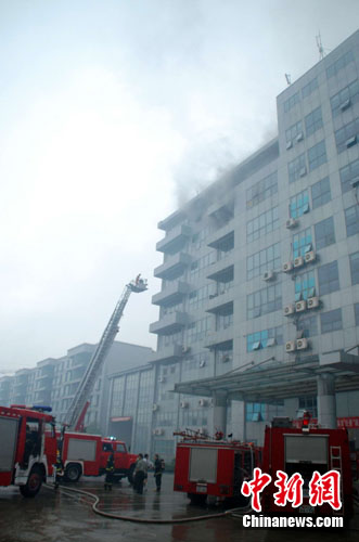 中新网南昌7月7日电(何柳斌 陈乃国)7日上午9时许,位于江西宜春市闹市区的移动公司办公大楼8楼突发大火,当地消防部门紧急出动7台消防车历经1个半小时的冒雨奋战,才将大火扑灭,所幸没有人员伤亡。