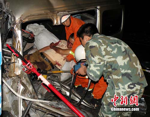 中新网汶川7月26日电(李涛 刘忠俊)26日凌晨,四川汶川县草坡隧道两公里处发生一起车祸事故,车牌为川U的大型水泥搅拌车与一辆面包车相撞,造成一名驾驶员受伤被困。