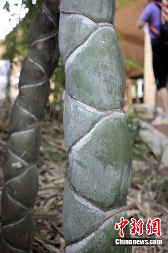 中新网成都7月26日电(王旭)7月26日,山东游客段先生一家在中国最美的十大森林——长宁县蜀南竹海旅游时惊奇地发现,茂密的竹林里居然有几株怪竹。怪竹的外形与众不同,竹子长得较粗壮,两米左右高,最有特点的是竹子的全身呈鱼鳞状,且凹凸不平,与普通的竹子外观大相径庭。
