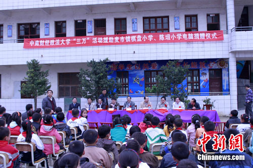 根据麦市镇的实际需要,中南财经政法大学还采取结对帮扶方式,当天举行捐赠仪式,向麦市镇棋盘小学、陈段小学分别各捐赠了电脑25台。
