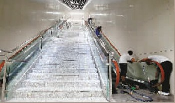 这个阶梯共有4组,每组16梯,可以选择步行爬梯,或者选择两侧的自动扶梯,就可进入1号线售票厅。从这里进入候车站台共有两个入口,需要下行30多个台阶。