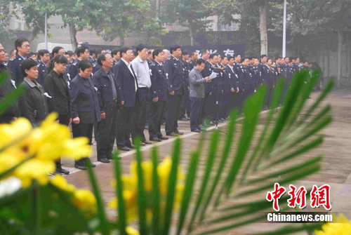 中新网石家庄10月9日电(陈林 张华伦)追逃铸警魂,浩气永长存。9日,河北石家庄阴雨蒙蒙,“清网行动”中牺牲的正定县公安局民警胡斌卫追悼仪式在该局举行,省、市公安部门领导和社会各界代表千余人参加。
