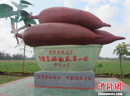 “美丽中国幸福海南—庆祝海南建省25周年全国百家网媒看海南”媒体报道团22日上午来到海南澄迈县桥头镇沙土村,此地除了以长寿之乡文明,其富硒地瓜也因美味健康成为当地名片之一。图为该村村口的地瓜雕塑。中新网 何敏 摄