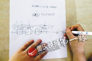 重庆晚报记者凑近发现,小明宇写了一长串公式。或许是中间出了什么问题,他停了下来,不断用右手挠头,眉头紧锁。“原来是这样的。”一阵小声自言自语后,小明宇仿佛豁然开朗。估计是有个环节算错了,他用笔将原来公式划去,又列了一长串新公式。