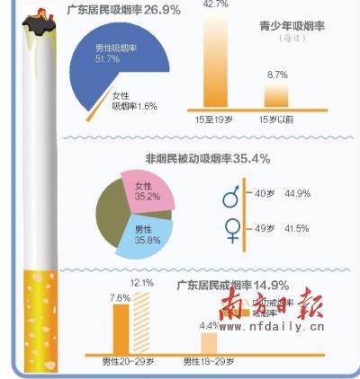 今天是“世界无烟日”,目前广东到底有多少烟民?2010年,广东省疾病预防控制中心在全省开展成年人慢性病及其危险因素监测调查,近期,调查数据的整理分析工作刚刚完成。数据显示,广东有超五成的男性为烟民,戒烟率与2004年相比略有下降,而非烟民的二手烟暴露率则达到了60%以上,估计全省有4000万人深受二手烟毒害。