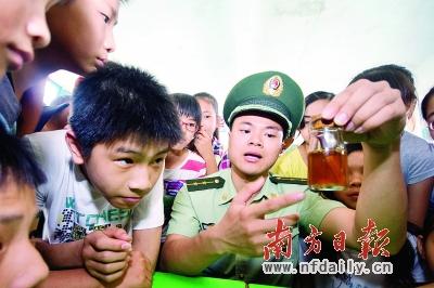 昨日,在第26个“世界无烟日”来临之际,揭阳边防官兵走进辖区学校,向同学们展示一支烟的焦油含量。李锋 贝尔 周游 摄