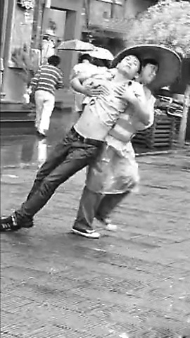 环卫工雨中救助路边抽搐男子