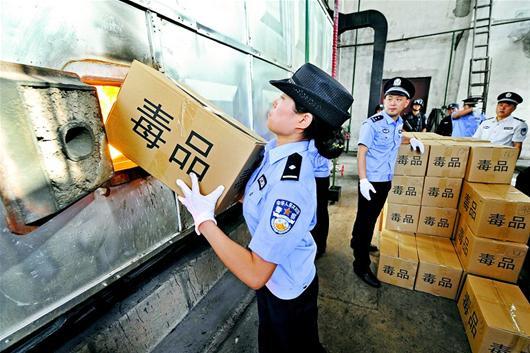 昨日,58只装毒品的大纸箱从一名民警手上传递给工人投入武钢炼钢炉内化为灰烬。当天是“国际禁毒日”,武汉警方销毁一年来收缴的部分海洛因、麻果、冰毒、K粉等各类毒品425公斤,市值过亿元。