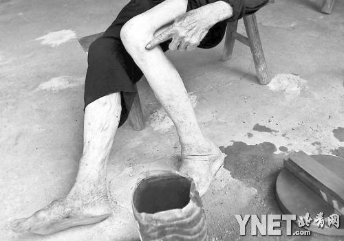 而叶有志81岁的父亲叶光亮如今瘦得只剩下一把骨头,被查出镉中毒一年后,老人全白的头发便掉光了。如今的他走路都变得很困难,每天脚上都会长出一种红色的蜡状物,但他拒绝去医院看病。全家老小五口人的生计都依赖叶双的父亲在镇头做些零工,叶光亮不想让背着一家人的孙子再为自己花钱看病。