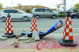 昨日中午,记者赶到现场,由于距事发时间已经有几个小时,现场已经被清理完毕,不过路上的刹车痕仍清晰可见。在路边一根路柱缺失,只剩下基座的铁皮,铁皮严重变形。而距离此路灯前方约30米的另一根路柱,底部也有被撞的痕迹。据附近居民介绍,昨日上午,这个位置曾有一根被撞后呈45度倾斜的路柱,8时许被一辆吊车吊走。