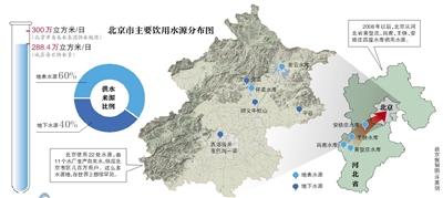 北京供水水源包括了本地地表水和地下水,以及外来水源。其中60%使用地表水源,40%使用地下水源。