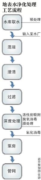 处理地表水水源时,要经过混凝、澄清、过滤,然后经臭氧和活性炭、超滤膜、微砂加速沉淀、高密度澄清等深度处理,氯化消毒输送至泵房,最后进入供水管网,确保出厂水质全部达到或优于国家标准。