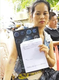 最严重的一次,是发生在2010年国庆节,晚上9时多,蔡女士在邻家姐妹的邀请下去喝茶。在晚上11时回来的时候,丈夫李开伦就开始对她进行肆意殴打,用棍子、脸盆等物品往她身上打,在推攘她的时候,还导致她的头部撞到了铁门上。经医生诊断,她头顶内部有淤血形成的很大血块。时至今日,这个大血块还没有完全消失。只要阴雨天气,蔡女士的头部就会昏昏沉沉、眼花缭乱,甚至会突然无故昏倒。