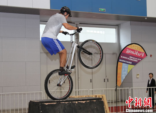 9月5日,一名自行车运动爱好者在展示攀爬技艺。中新社发 郭晓帆 摄