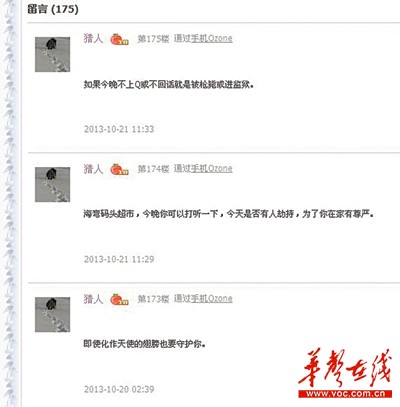 10月21日下午,记者进入彭武口中所说的”女友“张诗懿的空间发现,彭武从去年8月开始就在其空间内频繁留言各种情话,以表达自己的爱慕和思念。而在挟持事件发生前的20分钟,彭武还在其空间留言称,让张“打听挟持事件,这是为了你在家更有尊严”。(三湘华声全媒体记者 王智芳 潘显璇 实习生 陈杰 刘文彦)