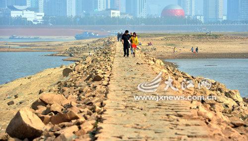 由于近期赣江水位持续下降,赣江南昌市红谷滩段的石坝露出水面,成了一个新景点。受降雨偏少、河床下切等因素影响,赣江水位持续快速下降。5日8时,赣江南昌段出现11.90米的低水位极值,又是一个历史新低。本报记者杨继红摄