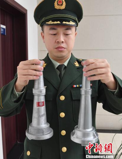 图为消防人员手举真假两个消防产品,无红色标识的为“山寨”产品。 张东清 摄