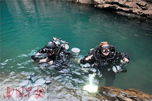 2012年下半年,他们带着更为专业的潜水设备再次来到都安。在大兴乡九顿村澄江河源头,他们潜入地下洞穴后发现,澄江河的源头是一条地下暗河岩溶泉。“世界级的巨大!”塞班这样形容澄江河埋藏在地下的源头。此外,这次潜水,他们也刷新了中国洞穴潜水深度的纪录,达到122米。