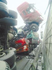 昨日,记者在事发现场看到,跌落近6米错层的事故车辆同样为一大型拖挂车(宁D6086挂),在同一位置冲出护栏后,“砸”中对向而来的货车(冀FF9917),车头和车身严重变形,并狠狠压住对向货车的车头,货物散落一地,致被压货车内2人死伤。“前面刚好堵着的,我们就停车在休息。”据伤者介绍,事发时,车内两人均在座椅后面的休息空间内睡觉,“谁知飞来横祸。”目前,事故具体原因还在进一步调查中。