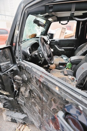 12月14日14时30分许,雁翔路发生一起械斗案。奔驰、路虎、宝马等4辆豪车,追赶1公里左右,将一辆JEEP牧马人越野车强行逼停。因遭到强行撞击,牧马人毁损严重,三个轮胎爆裂,车身多处被砸,除车前挡风玻璃被砸成蛛网状外,其他车窗完全被砸碎,驾驶室里散落砖头,方向盘及车门上也留有大量血迹。