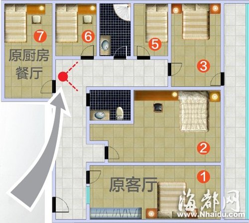 记者昨日在4502看到,整套房子没有厨房、客厅,已被隔成8间,其中2间卫生间、6间住房,每间住房的门上均贴有编号,分别为“1、2、3、5、6、7”。
