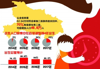 从全省来看,62.94万对符合单独二孩条件的夫妇中,70%有意愿生育二孩,可能增加人口46.6万人。这些人口将集中在政策调整前4年出生,预计2014年—2017年分别占3%、31%、25%和23%,全省出生总量分别达到78.1万、89.9万、84万和80.1万。