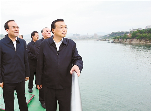 李克强来到轮船甲板上,认真观察港口基础设施和航道建设情况,与有关部委负责人共商长江黄金水道未来发展大计。他说,长江黄金水道是贯通东中西部、通航能力最强的航道,要用黄金水道串起长江经济带“珍珠链”。