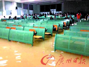 北师大珠海校区国金专业大二学生小转向记者报料,珠海的大雨从昨日下午一直下,下午一两点,学校多处出现各种“水情”。“丽泽湖水都漫到人行道上了,水深及脚踝。最夸张的是教学楼励耘楼,一楼的阶梯教室都进水了。”据她发布的照片来看,一楼的阶梯教室大约有9排,前5排都被黄黄的雨水泡着,“站在教室的底部,水大约有三四十厘米深。”教室外面的盆栽都泡在水里了,从教学楼往外看都是“无敌海景”。(记者钟敏)