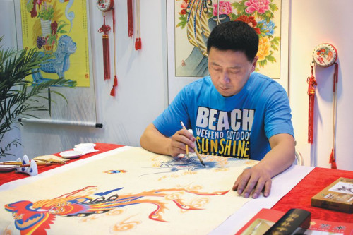 凤阳凤画传承人涂冬颀在现场创作。凤阳凤画又称龙凤画,源于明初,其凤凰造型必须是“蛇头、龟背、鹰嘴、鹤腿、如意冠、九尾十八翅”等,聚集了百鸟之长。